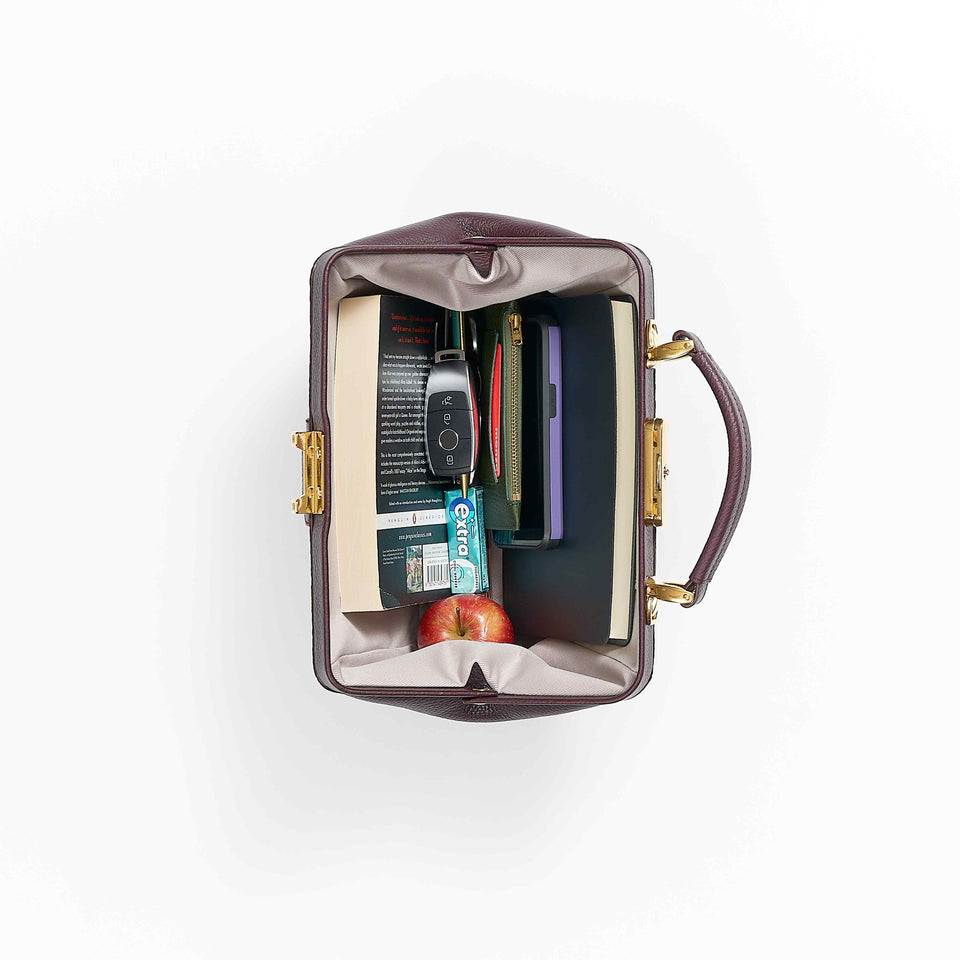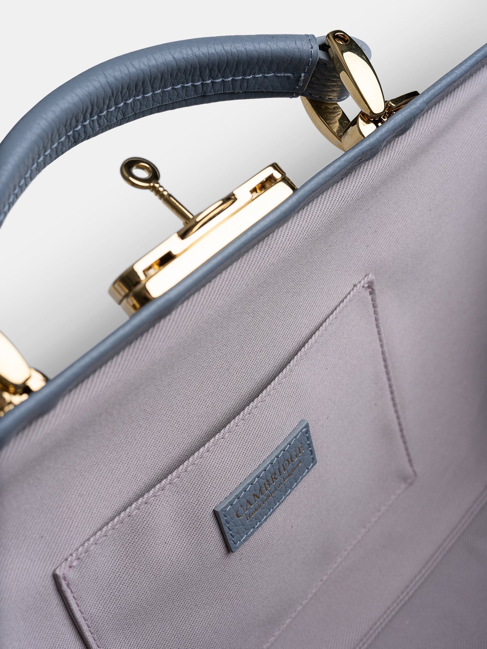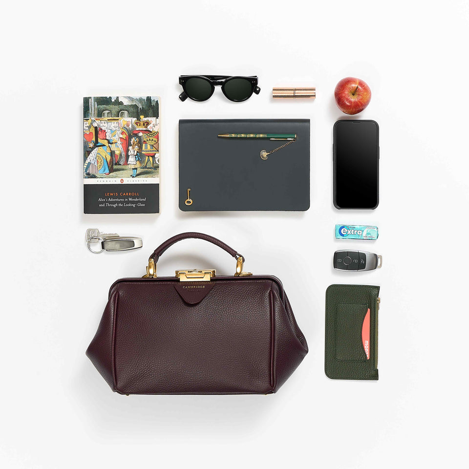 ソフィーのデザインを完成させるのに 6 年かかりました。最適なグレードの柔らかいカーフグレインレザーの調達や、スリムで取り外し可能なストラップを取り付けることができる本体金具部分に時間をかけました。レザーの持ち手で運んだり、ストラップで肩に掛けたりできます。プレミアムな「CAMBRIDGE」コレクションなので、カチッとしっかり閉まる留め具や小さなキーを含め、金属部分をゴールドにアップグレードしました。内側には高級感のあるコットンツイルを使用しました。開口部のタブと、内ポケットには、ゴールドで型押しされたコレクション名があしらわれています。